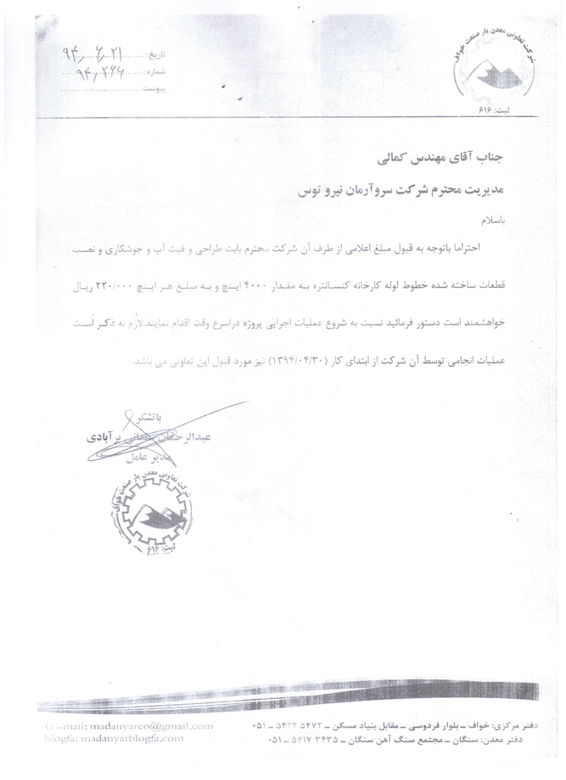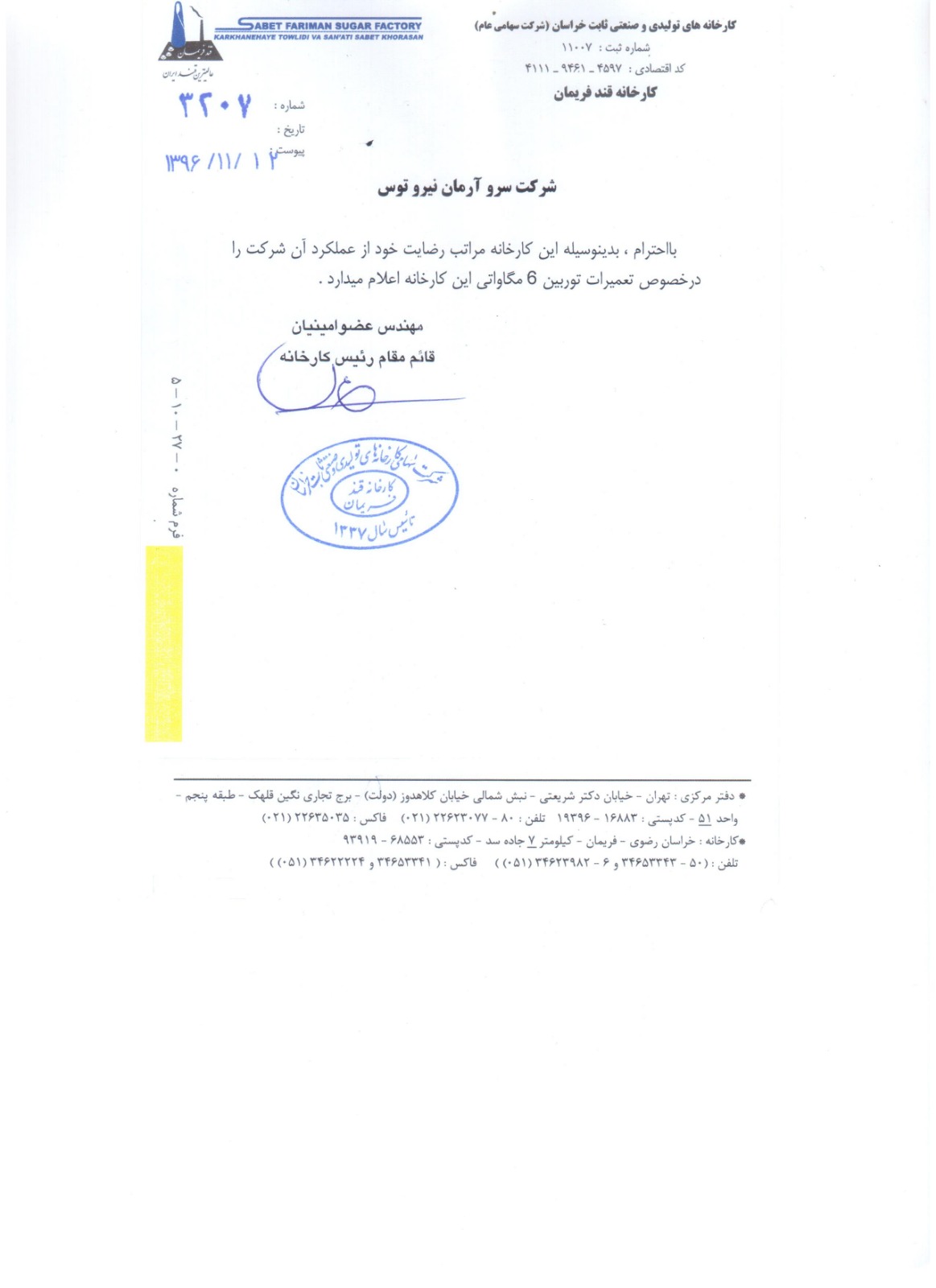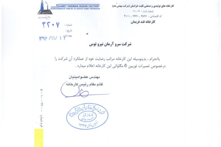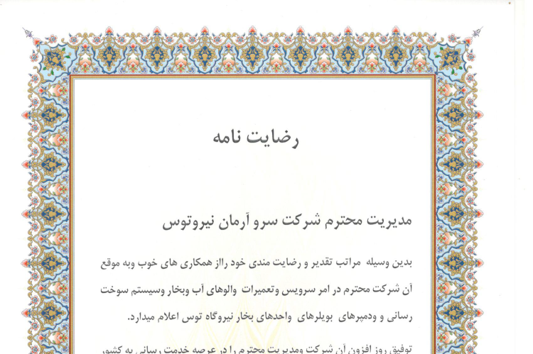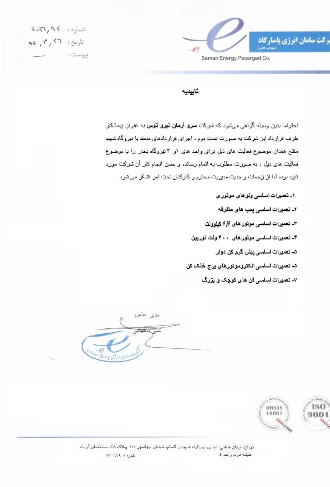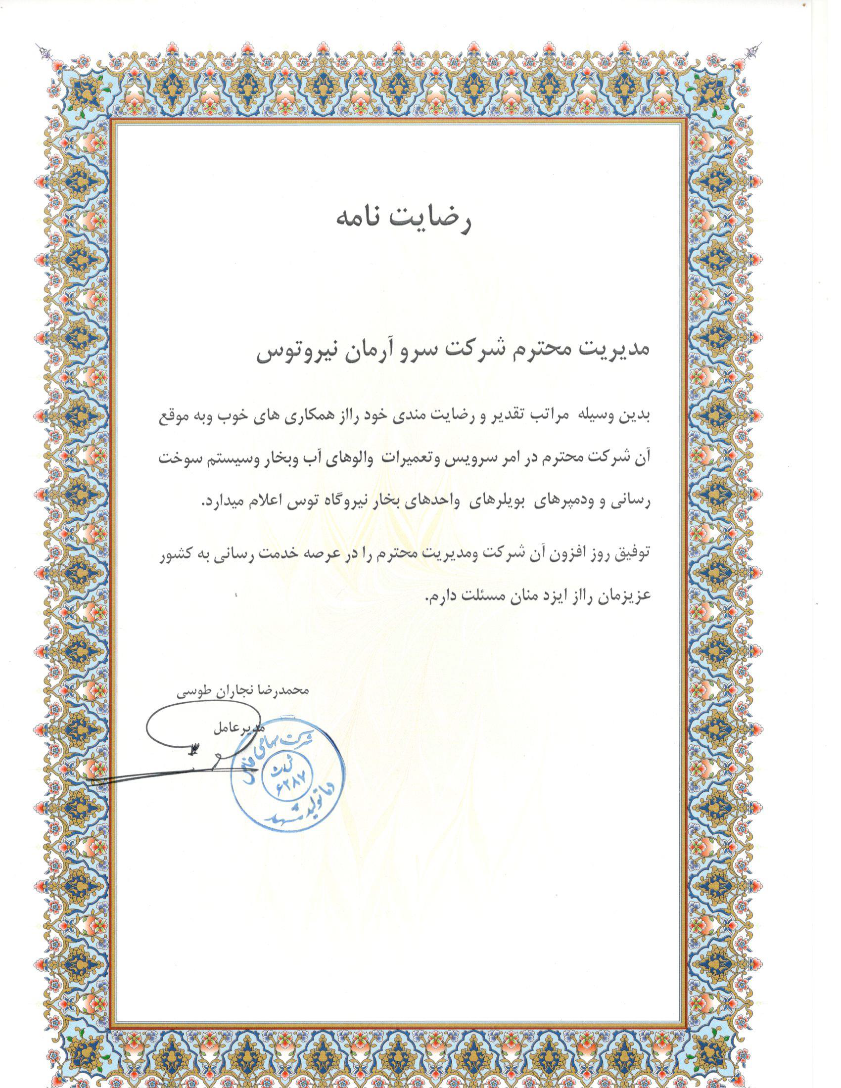 شرکت سرو آرمان نیرو توس، مستقر در ایران، تحت مالکیت و مدیریت مهندسین مجرب با چشم انداز تجاری برای کسب و حفظ رضایت مشتری با ارائه راه حل های با ارزش افزوده در صنایع تخصصی مادر همچون مانند تولید برق و بخش نفت و گاز، پتروشیمی و پالایشگاهی در سال 1392 تاسیس گردید.